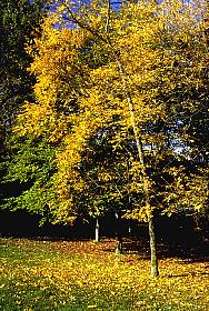 to the right Origin: North America and China, introduced to France at the end of the XVIIIth century. Size: 30 m tall. Distinctives: slim grey bark; leaves composed in 3 - 17 leaflets.