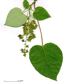 Deciduous foliage. 25 cm long, triangular blade, heart-shaped base, roughly toothed margin, bright dark green on top, light green underside. It resembles the leaf of some Asian poplars. The petiole is long and red.
