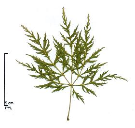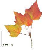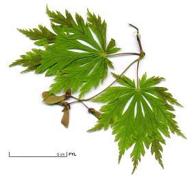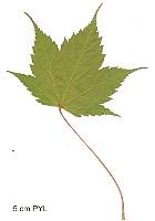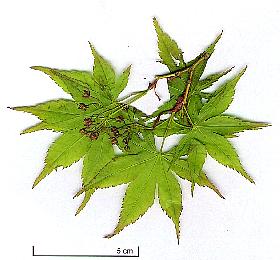 | Downy Japanese Maple or Fullmoon Maple (A. japonicum): leaves rounded, composed with 7 to 11 acuminate lobes (less deep than in A. palmatum), border with sharp teeth; 13 cm long (bigger than that of A. palmatum); downy short petiole; green colour turning to the red in autumn.