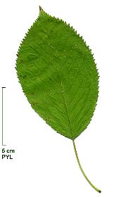 Deciduous foliage. Elliptical leaves, of 12 cm long, slightly heart-shaped base on some varieties (Bird cherry, Prunus padus), tip (apex) acute (acuminate), roughly toothed margin. On the underside, the sides of the ridge are lined with red hair. At the base of the lamina, two or three nectaries (glands melliferous) secrete a sweet liquid that attracts ants, which thanked the cherry tree by protecting it from insects that can chew the leaves (typical of Prunus species). |