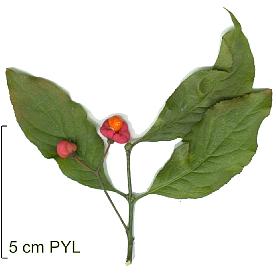 Latin name: Euonymus europaeus. Etymology: its nickname, "cap", comes in the form of square cap of its fruit. Habitat: the Spindle tree accepts limestones. Hardiness: zone 4 (it supports cold until -35 °C or -31 °F). Size: shrub of 7 m tall. Shape: ovoid, ascending branches. Bark : dark grey, deeply cracked. Foliage: deciduous. Elliptical, opposite leaves, sharp; margin with fine dentils. Flowers: in May-June, disposed in cymes by 3 - 5; petals yellow-green. Fruits 4 lobes, red, opening to free their seeds of orange colour. Use: decorative garden shrub, isolated or in hedge. Danger: the fruit of the spindle tree causes vomiting. |