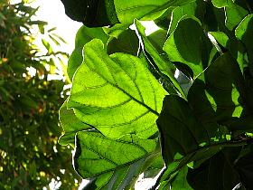 Persistent foliage. Big leaves alternate, short petiole, tough, bright, dark green on the top, clearer underside, of 40 cm long on 20 cm wide. Wavy margin. The leaves of the fig lyre are in the form of lyre. Nerveses are salient and clearer.