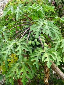 Fruit in clusters attached to the trunk. The fruit, papaya is a berry 15-40 x 7-25 cm, orange pulp, compact, high-fiber fetid odor, and blackish seeds. The seeds have a slightly peppery flavor.