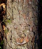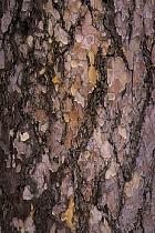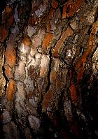 Bark shedding in scales grey reddish-brown, clearing clearer zones, pink-orange at the top. cracked thick, red-purple on the bottom of the trunk, pink-orange in ferruginous red on the top cracked reddish-brown-red with big vertical grey flakes. clear veined of deep black fissures