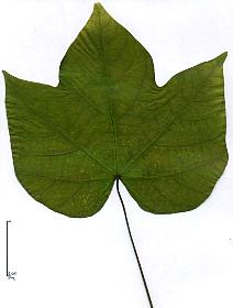 Very big leaves (40 cm), lobbed as those of the fig (to which they resemble), smooth on the top, clear and tomentose underneath. Long petiole.