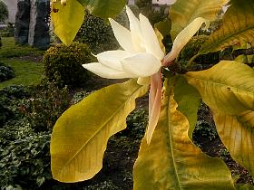 Deciduous, very big leaves (from 30 to 60 cm), green yellow. The leaf is spatulate (broader in 3/4 of its length), on sharpened base, and acuminate (ending in tip). Because of its big size, it is fragile and can be torn by the wind, the rain, the hail. Its pace drooping is of a strange effect. It gathers in whorl at the end of stems and envelops flowers, hiding it somewhat.