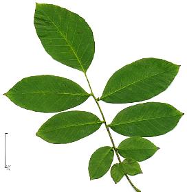 Deciduous foliage. Leaves alternate, big (30-50 cm) composed of 7 to 11 oval leaflets of increasing size towards end. The final leaflet is bigger and can attain 15 cm long. Leaflets are glabrous, thick or even tough and aromatic. Their margin is smooth.